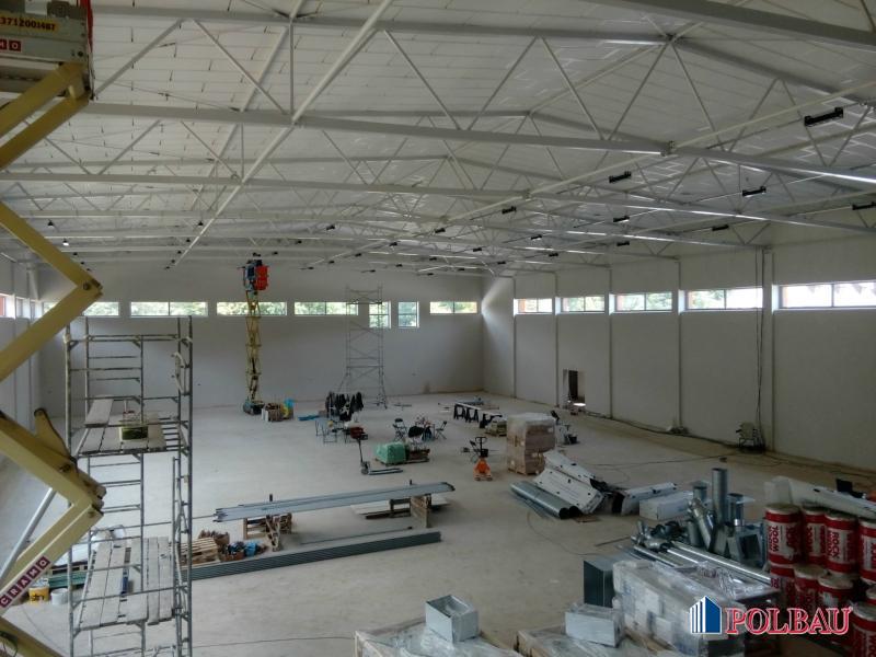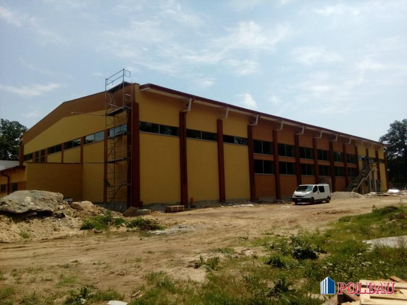 Inwestycja to pełnowymiarowa hala sportowa o konstrukcji żelbetowej monolitycznej, jednonawowa. Słupy o przekroju 40x60 cm w rozstawie co 5,0 m stanowią podporę dla dźwigarów stalowych o rozpiętości 28,00 m.