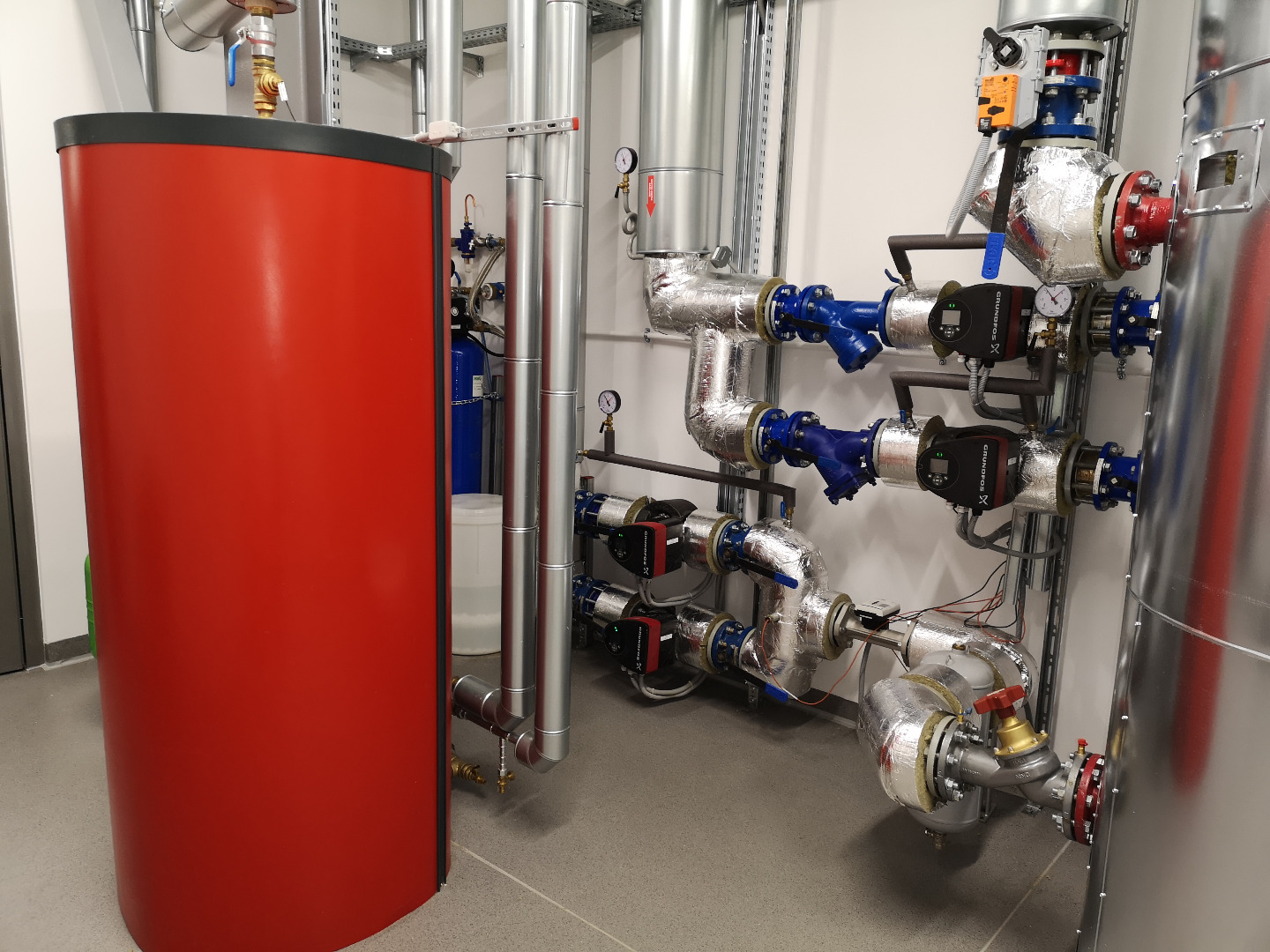 Wbudowane obiekty technologiczne i techniczne: 2 agregaty wody lodowej, zbiornik na wodę deszczową 50 m 3 , 2 centrale wentylacyjne, 2 sprężarki.
