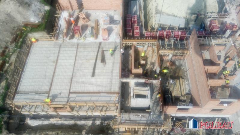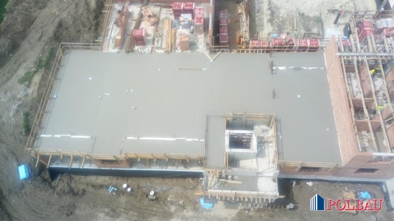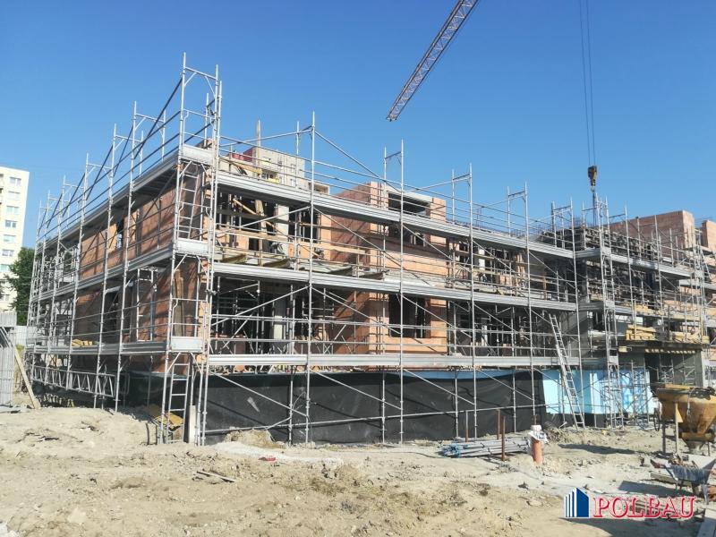 Zagospodarowanie terenu wraz z drogami wewnętrznymi oraz parkingami. Fundamenty w formie dwóch z dylatowanych płyt żelbetowych gr. 50 cm. Ściany piwnic nośne; wykonane z żelbetu o strukturze naturalnego betonu. Ściany nośne wykonane z porothermu gr. 25cm wzmocnione filarami, trzpieniami, słupami, podciągami żelbetowymi. Ściany wewnętrzne: działowe porothermu gr. 11,5 cm oraz 8 cm. Stropy konstrukcyjne wykonane z płyt filigran. Do komunikacji zaprojektowano trzy klatki schodowe z centralnym usytuowaniem w każdej z nich monolitycznego, żelbetowego szybu windowego, w którym zamontowano dźwig osobowy dostosowany do transportu osób niepełnosprawnych. Dach wykonany z konstrukcji drewnianej kryty papa zgrzewalną.