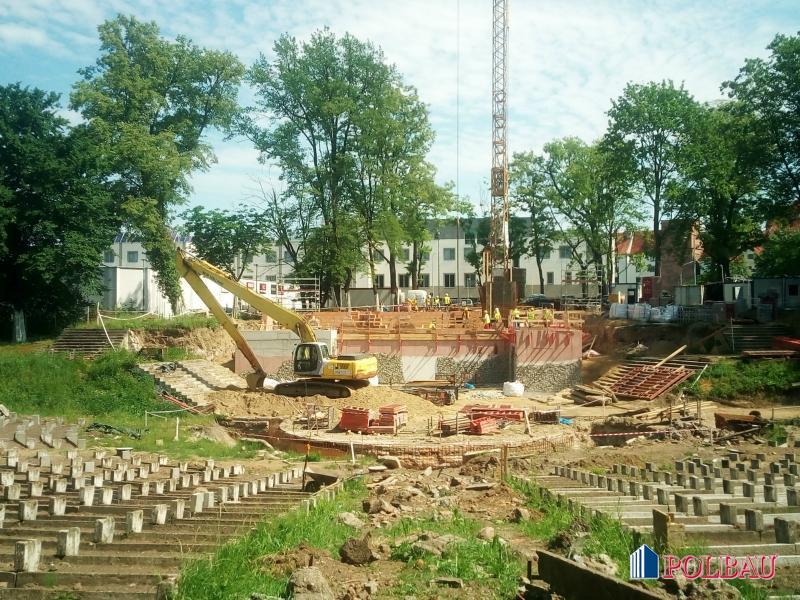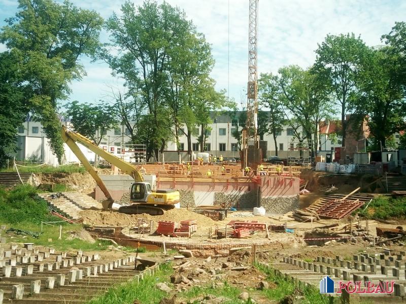 Dwukondygnacyjny budynek zaplecza sceny posadowiony jest na studniach fundamentowych z kręgów żelbetowych, opierających się na żelbetowych korkach. Stropy, fundamenty oraz pierwsza kondygnacja wykonana jest w technologii monolitycznej, natomiast druga kondygnacja – w technologii murowanej. Całość obiektu zostanie zwieńczona systemowym dachem zielonym, a elewacja jest odtwarzana na wzór pierwotnej, czyli licowana z kamienia łamanego granitowego. Do budynku doprowadzone zostaną wszystkie media, a dodatkowo zostaną wykonane nowe ciągi komunikacyjne, ogrodzenia, a odnowieniu ulegnie widownia i tereny zielone.
