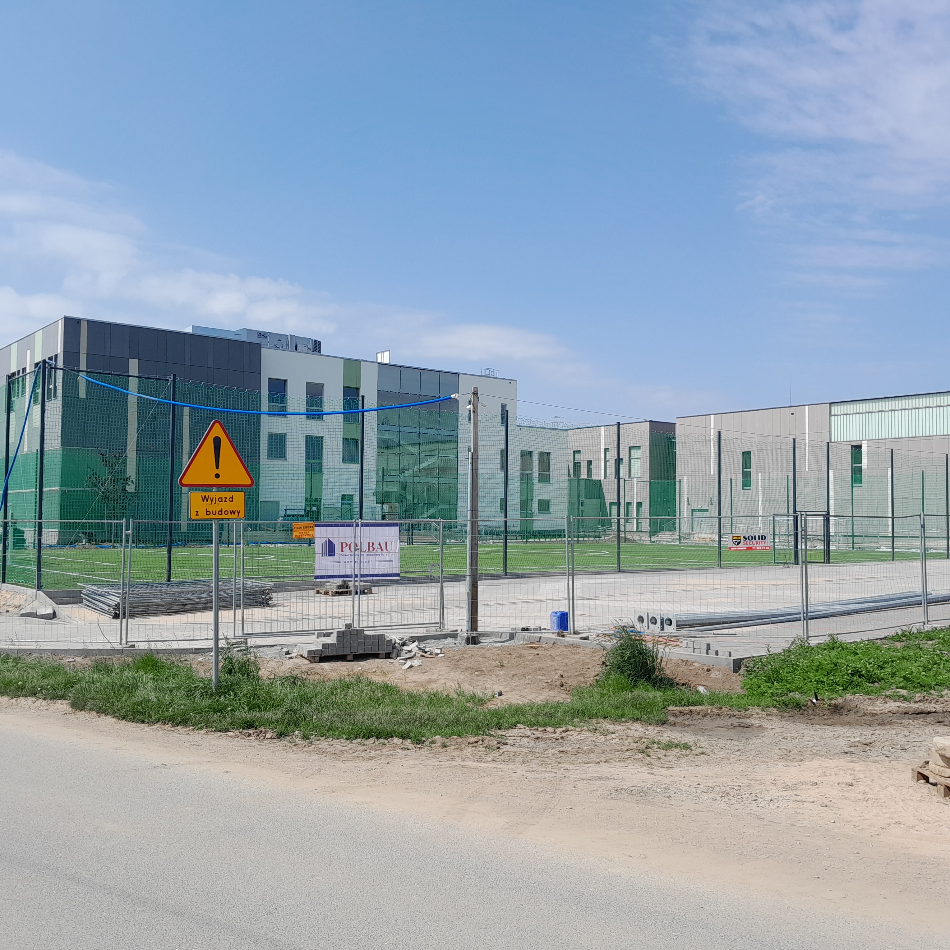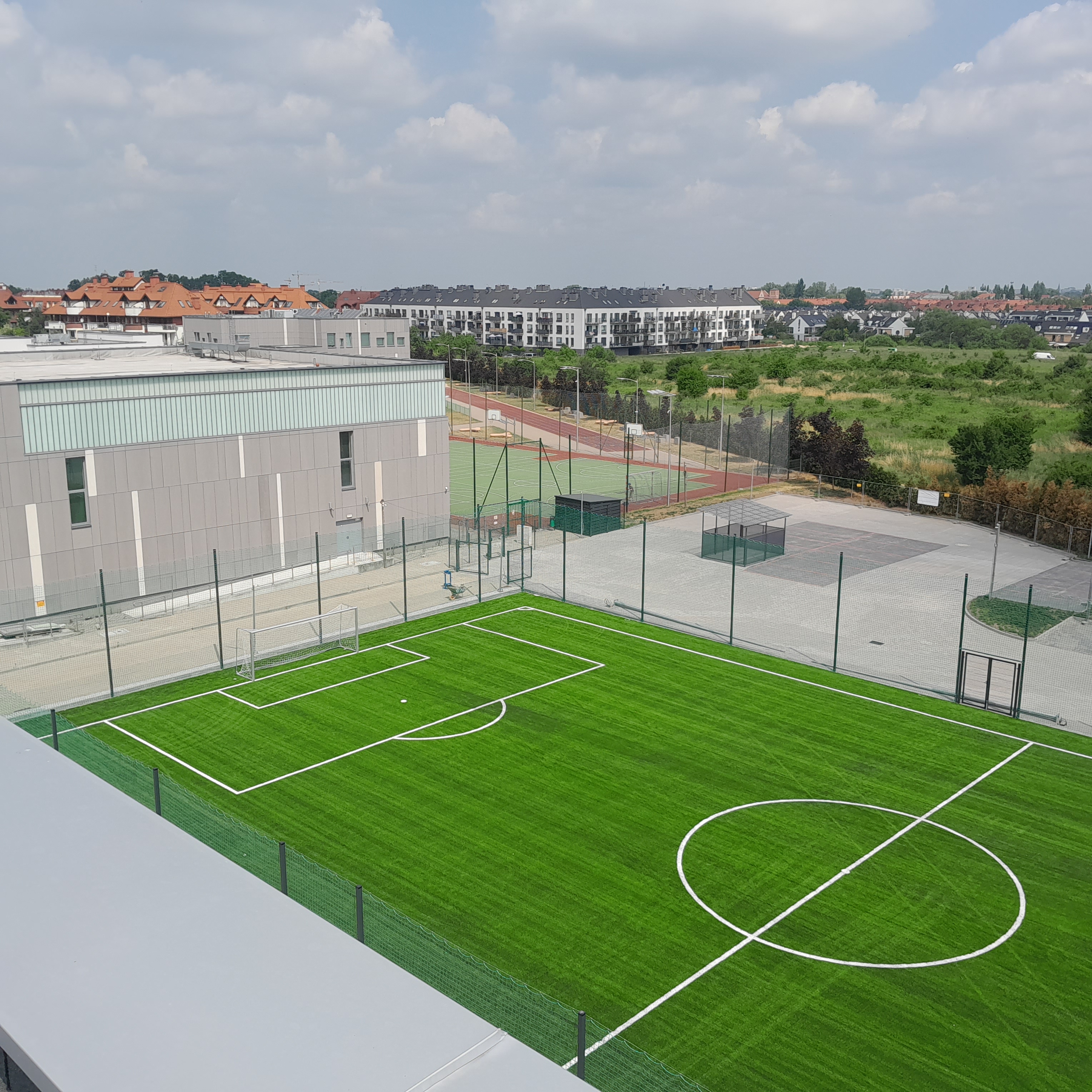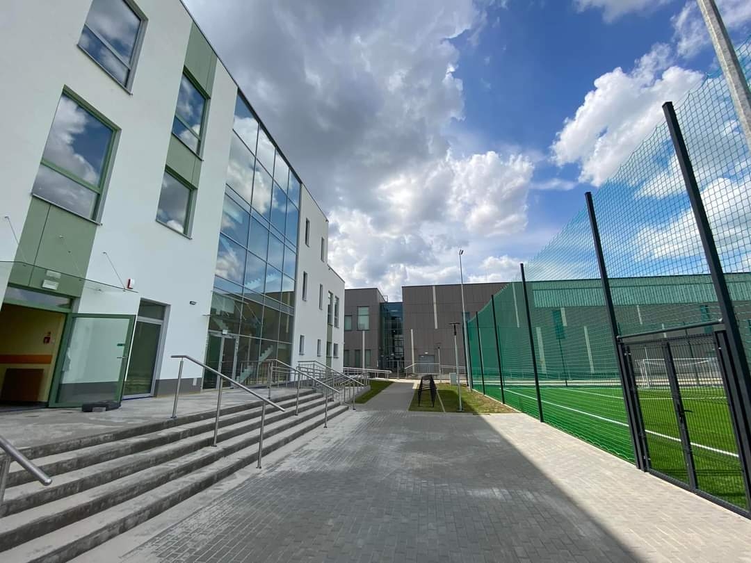 Na terenie inwestycji przewidziane zostały: wiata na odpady, wiata na sprzęt ogrodniczy, wiata na rowery, ogrodzenie z furtkami i bramami technicznymi. Projektuje się dwa rodzaje oświetlenia: specjalistyczne oświetlenie boiska, pozostałe oświetlenie ozdobne wzdłuż chodników, ciągu pieszo-jezdnego, parkingów.