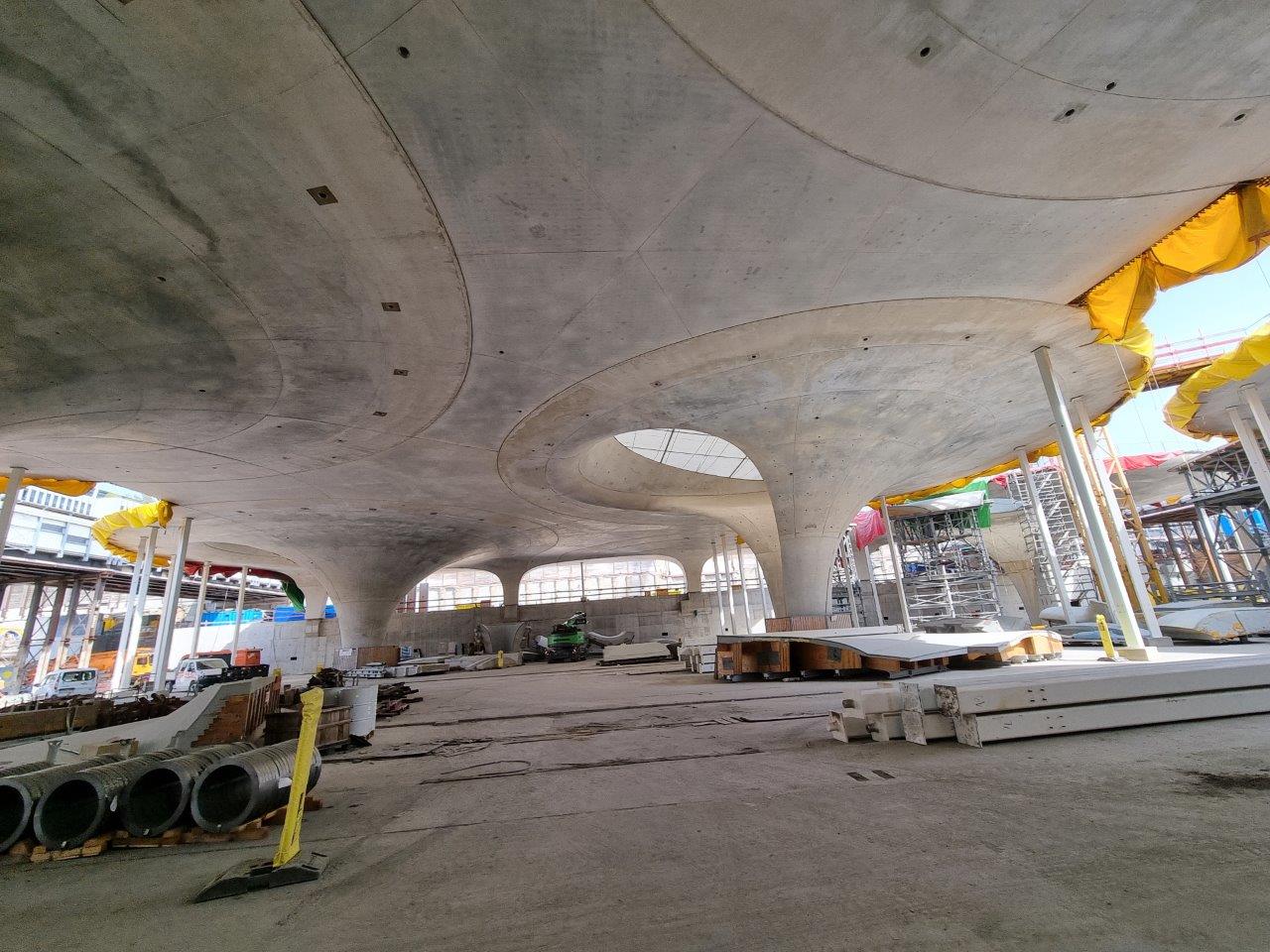 Das Schalendach besteht aus 28 sogenannten Kelchen mit Lichtaugen zusammen In einem Regelkelch nur im oberem Abschnitt wird 1.000m² Schalungsfläche geschalt, 360 Tonnen Bewehrungsstahl und mit 780 m³ Beton verfüllt.