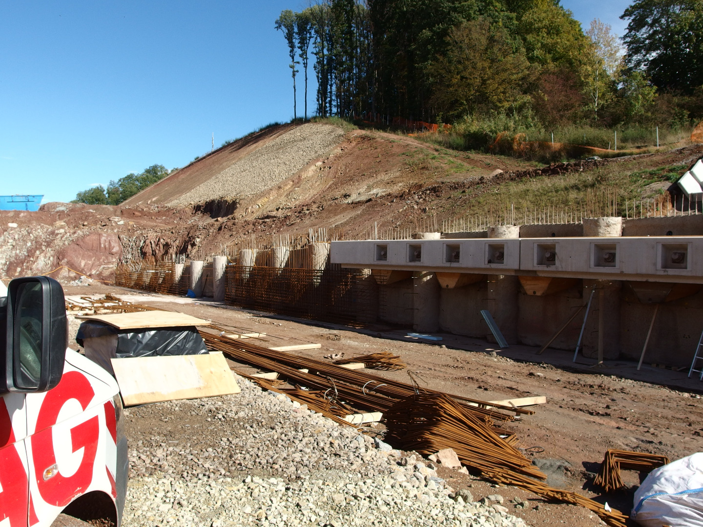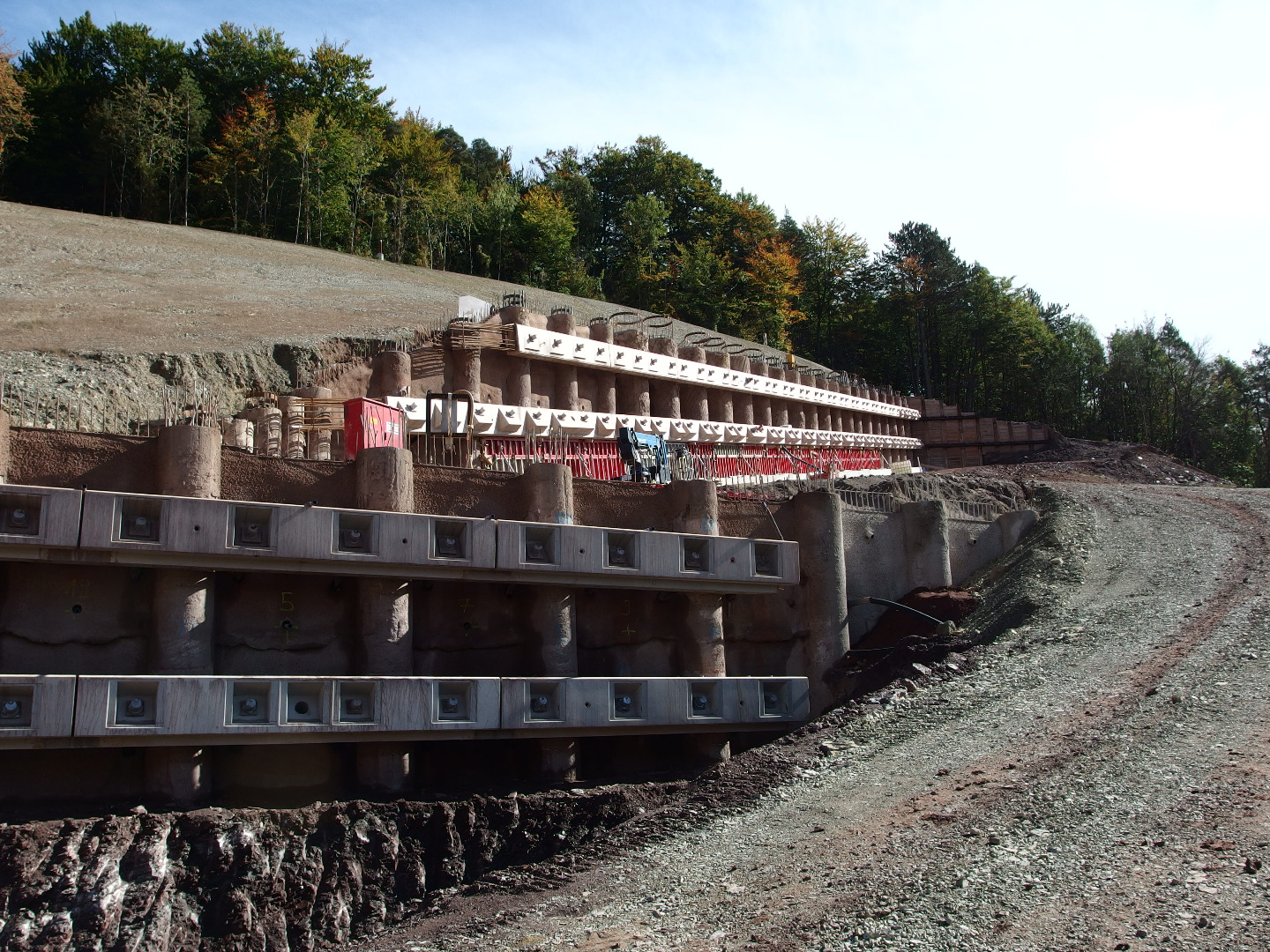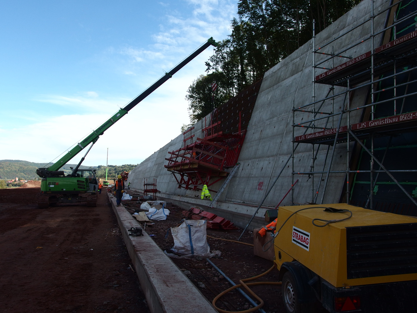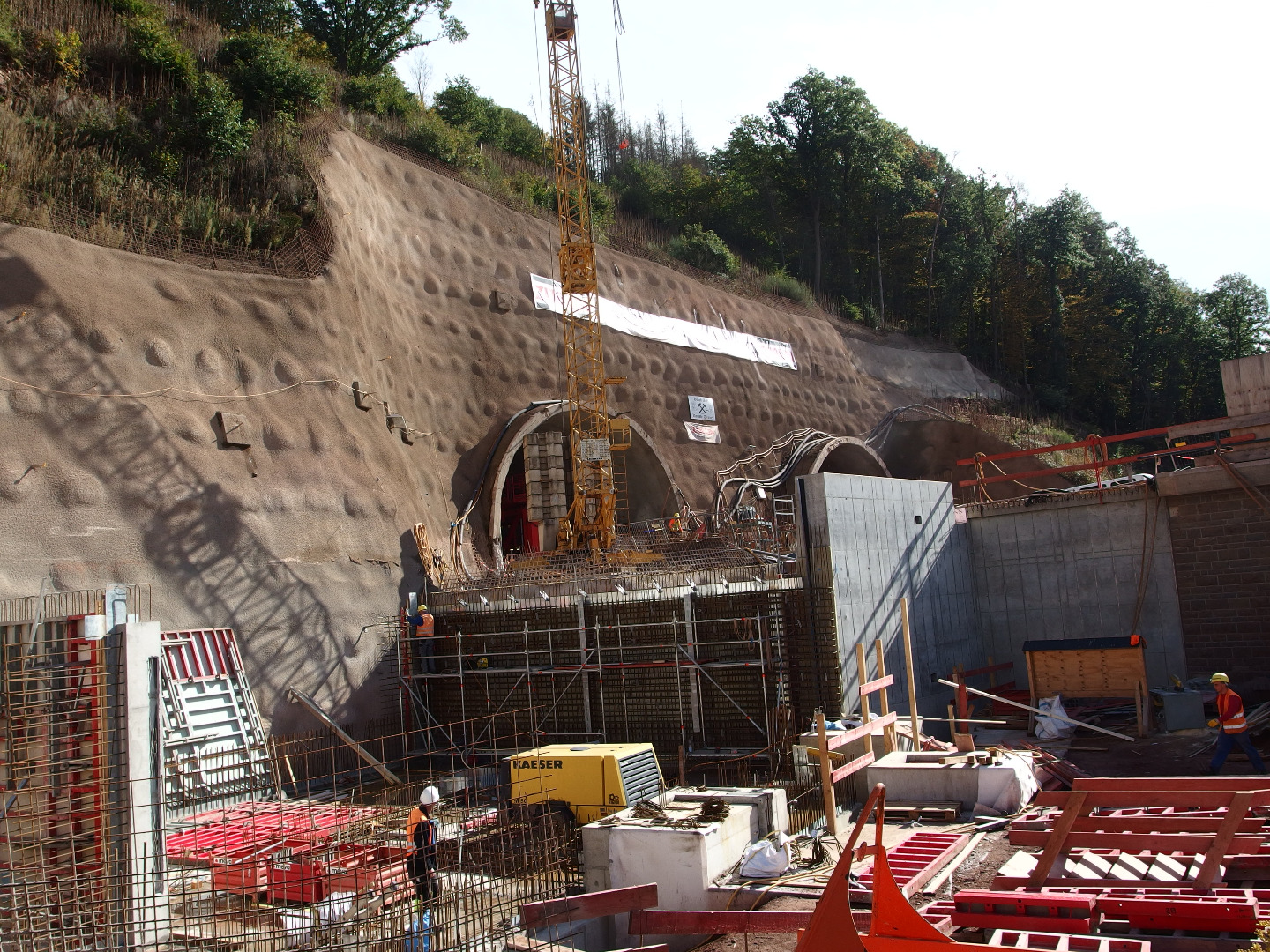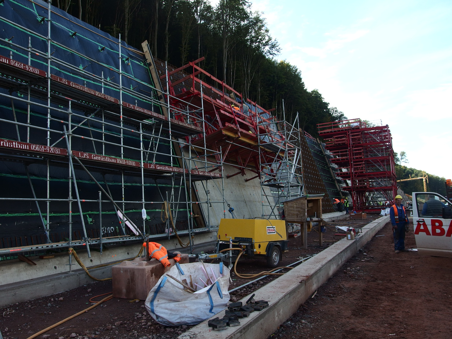 Zlecenie na zasadzie użyczenia personelu, w ramach którego wykonywane są różne roboty na obiektach pomocniczych. Liczne obiekty typu zbiorniki wody gaśniczej oraz budynki techniczne, jak również zabudowa skarpy skalnej na długości ok. 500metrów, w technologii żelbetonowej ze ścianami i słupami czołowymi. W celu uzyskania szybkiego postępu robót zastosowano jednostronny szalunek.